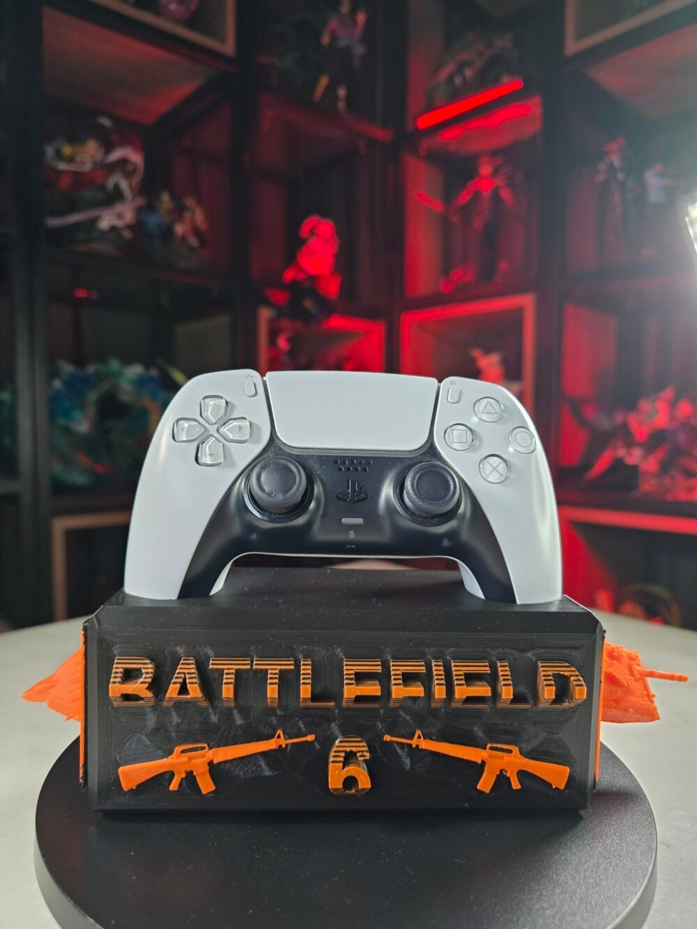 This Battlefield-themed PS5 controller stand is the perfect piece for any soldier-gamer’s desk or collection. Designed with precision, it features bold 3D-printed orange details, rifles, and the iconic Battlefield 6 logo — giving your controller the throne it deserves.