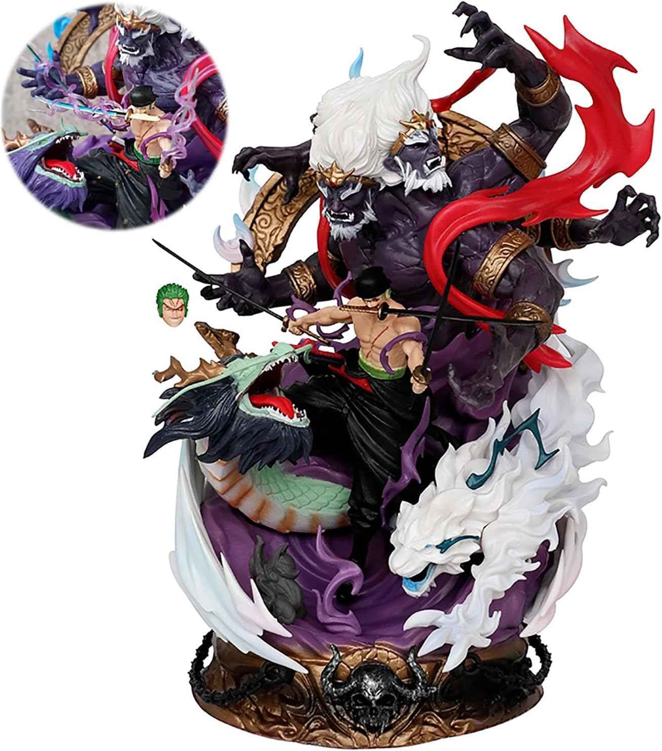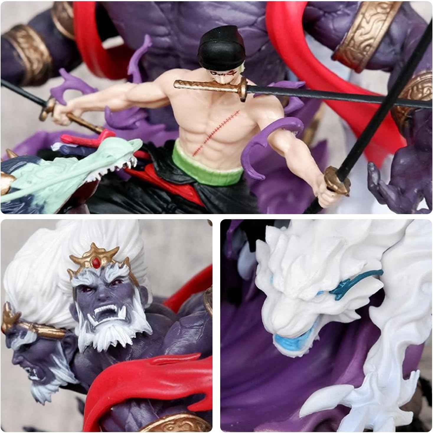 This figure captures Zoro mid-attack, surrounded by demonic energy, ferocious dragons, and insane battle detail.